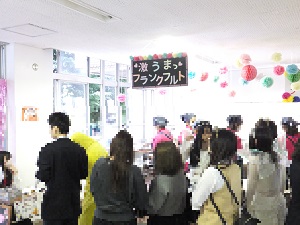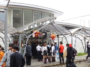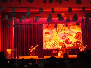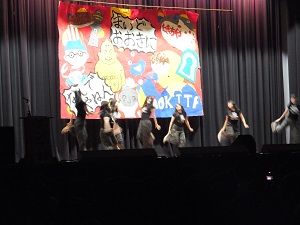 今日は文化祭2日目。生徒の皆さんは一旦体育館に集合し、日程や注意点について確認たあと、ダンス部の演技でスタートしました。体育館では軽音楽部や吹奏楽部、音楽選択者の発表が、校舎内では引き続き、クラブやクラスによる、展示やイベントが開かれました。屋外では飲食の模擬店に加え、古墳の広場では、書道部のパフォーマンスや有志によるダンスステージで盛り上がりました。