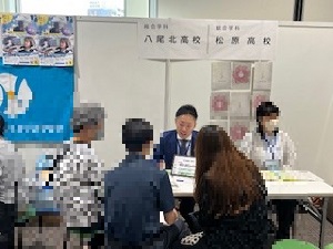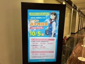 進学相談会(天満橋にて) 校長室から 2025.10.07 10月5日に、天満橋のOMMビルで開催された進学相談会に参加してきました。進路選択の時期が迫り、参加者も7月の進学フェアと比べると真剣な表情で会場をまわっている様子が印象的でした。本校にも、想定より多くの中学生が相談に来られました。中学生の皆さんは進路選択で悩むこともたくさんあると思いますが、悔いのない学校選びをしてほしいと思います。