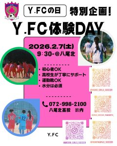 女子サッカー部イベント情報! 41期生 2026.02.04 2月7日(土) Y.FC体験会 時間:9時30分~12時00分 場所:八尾北高校 既に2名の中学生が参加予定です‼ 本件に関する、お問い合わせは八尾北高校(072-998-2100)にお電話していただき、籔内までお繋ぎください。もしくは各校のインスタグラムにDMをお願いします。 サッカー部女子部顧問 籔内 延佳